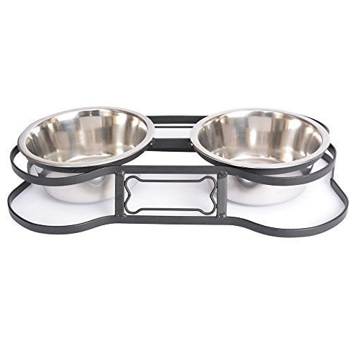 Two stainless steel bowls securely take their spot in the bone shaped wrought iron frame. Suitable for both dogs and cats.